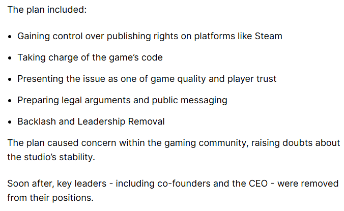 The plan, as advised by a large language model and adopted by a real human CEO, had three pillars. First, prepare "preemptive framing" around protecting product quality and fan trust. Translation? Manufacture a narrative that the game wasn't ready so they could justify a delay. Second, "secure control points" by locking down publishing rights on Steam and consoles. In other words, cut the studio off from its own game. Third, prepare "systemic materials for legal defense." Because they knew from the jump that this was going to end in a lawsuit.